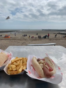 Eat your traditional beach day lunch – East Beach has a few little kiosks that sell chips, any fish you could possibly want, kids meals such as chicken nuggets, hot dogs, warm doughnuts, and more. There is also a cute little seating area on the beach with tables and chairs in case you didn’t bring your own. Eat up and enjoy the view…. Oh, and do not feed the seagulls because they will poop on you and scare a lot of people as they swarm over the entire seating area.